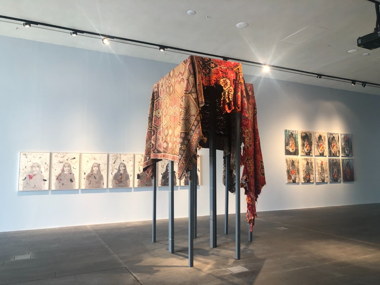 Sergi Koçan’ın sanatıyla müsemma, köklere yolculuk. Baksı’daki serginin açılışına katılmış ve süreci Koçan’dan dinlemiştim. “Ayağımdaki Diken” adını sanatçının çocukluk yıllarında Çoruh Nehri kenarında ayağına batan dikenden alıyor. Sergide yer alan işler de Koçan’ın çocukluk yıllarından başlayarak yaşadığı yere, hayatının duraklarına ve dönüm noktalarına temas ediyor. Yazarlar yaşadıklarını yazar ya hep, Koçan da yaşadıklarını yansıtmış işlerine. İlmek ilmek işlemiş hayatını… Bu otobiyografik sergide “Kök” teması hep ön planda. Serginin en ikonik işlerden biri de ters duran ağaç kökleri. Sanatçı burada uzun yıllar tüm badirelere rağmen ayakta kalmayı başaran kavak ağacını ters yüz ederek köklere ve kökün gücüne işaret ediyor. Serginin etkin temalarından biri de göç… AKM’de dolaşırken bireysel bir göç hikâyesini arkanıza alarak bugün yaşadığımız dünyaya dair sorgulama yapıyorsunuz. Ev neresidir, çocukluk nedir, aile bağlarının önemi soruları eşliğinde…