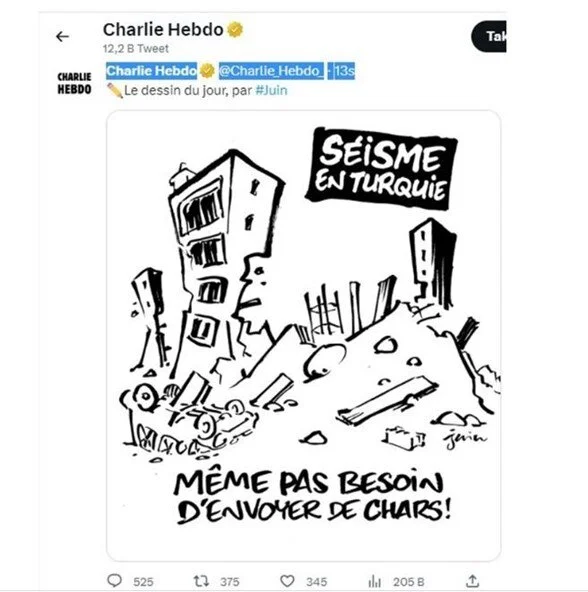 Bu karikatüre karşı ise Filistinli grafik tasarımcı Abrar Sabbah, yayınlanan karikatürü yeniden düzenleyerek, “Hey Ahlaksız Charlie Hebdo. Öyle çizmeyecektiniz. Böyle çizecektiniz! Yeniden ayağa kalkacağız. Bu güçlü millet yeniden ayağa kalkacak!” paylaşımını yapmasıyla sanatın ve dijital dünyanın rolünü ve etkisini tekrardan idrak ettik. Bu son yaşanan olay üzerine de yerli ve yabancı birçok sanatçının Türkiye’ye destek çizimleri arttı. Bizler de sanatçıların “Asrın felaketi için tasarladıkları çizimlerin toplumda yarattığı etki diğer olaylara nispeten yeri nedir?”, “Dijital dünyada sanatın bir silahı (güçlü bir sesi) olarak değerlendirirler mi?” sorularını karikatürist Dağıstan Çetinkaya’ya, Suriyeli grafik tasarımcı Abdullah Keshi’ye, illüstratör Büşra Yurtseven’e ve Sena Nur Toslak’a yönelttik.